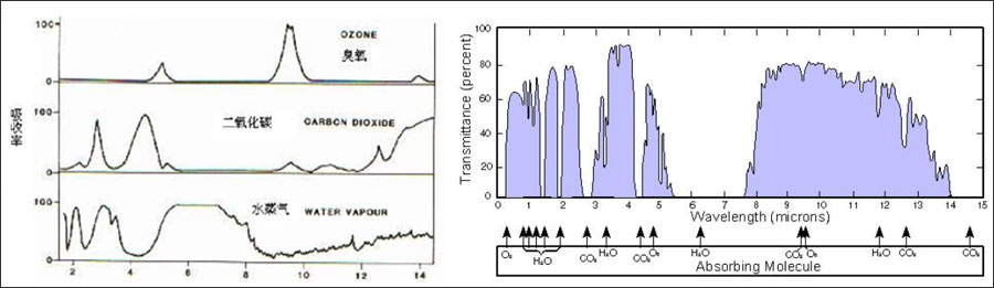 此外,CO2濃度的時(shí)空分布梯度與地表碳通量呈相關(guān)關(guān)系,熱紅外波長(cháng)大與4微米,大氣散射輻射不僅是大氣溫度的函數,而且也是大氣內部組成的函數。對于一個(gè)特定波長(cháng),吸收系數與大氣組成、溫度和壓力有關(guān)。一般大氣對熱紅外輻射的衰減主要是由氣體分子的吸收和氣體分子、氣溶膠的散射所引起的,大氣對熱紅外的吸收體主要是CO2、水汽和O3:
